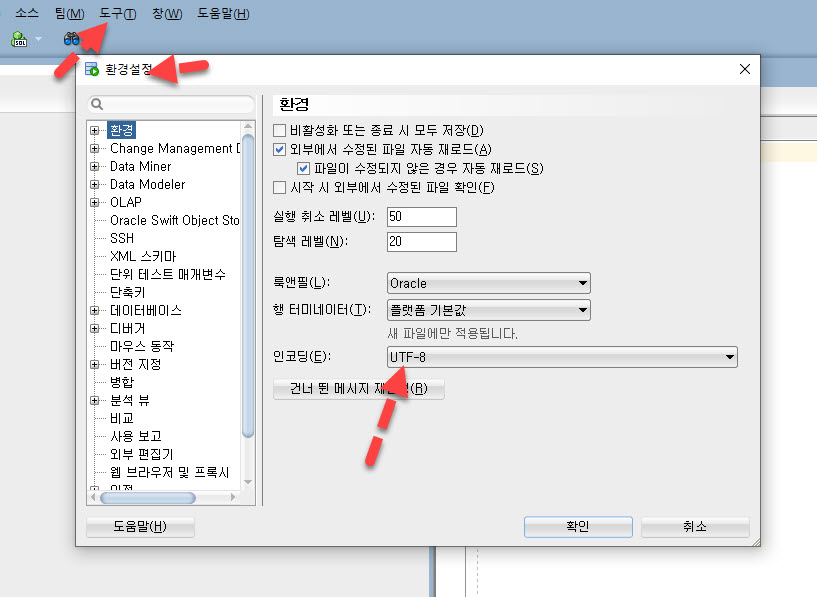 도구 > 환경설정 > 환경 > 인코딩을 UTF-8 로 변경한다.