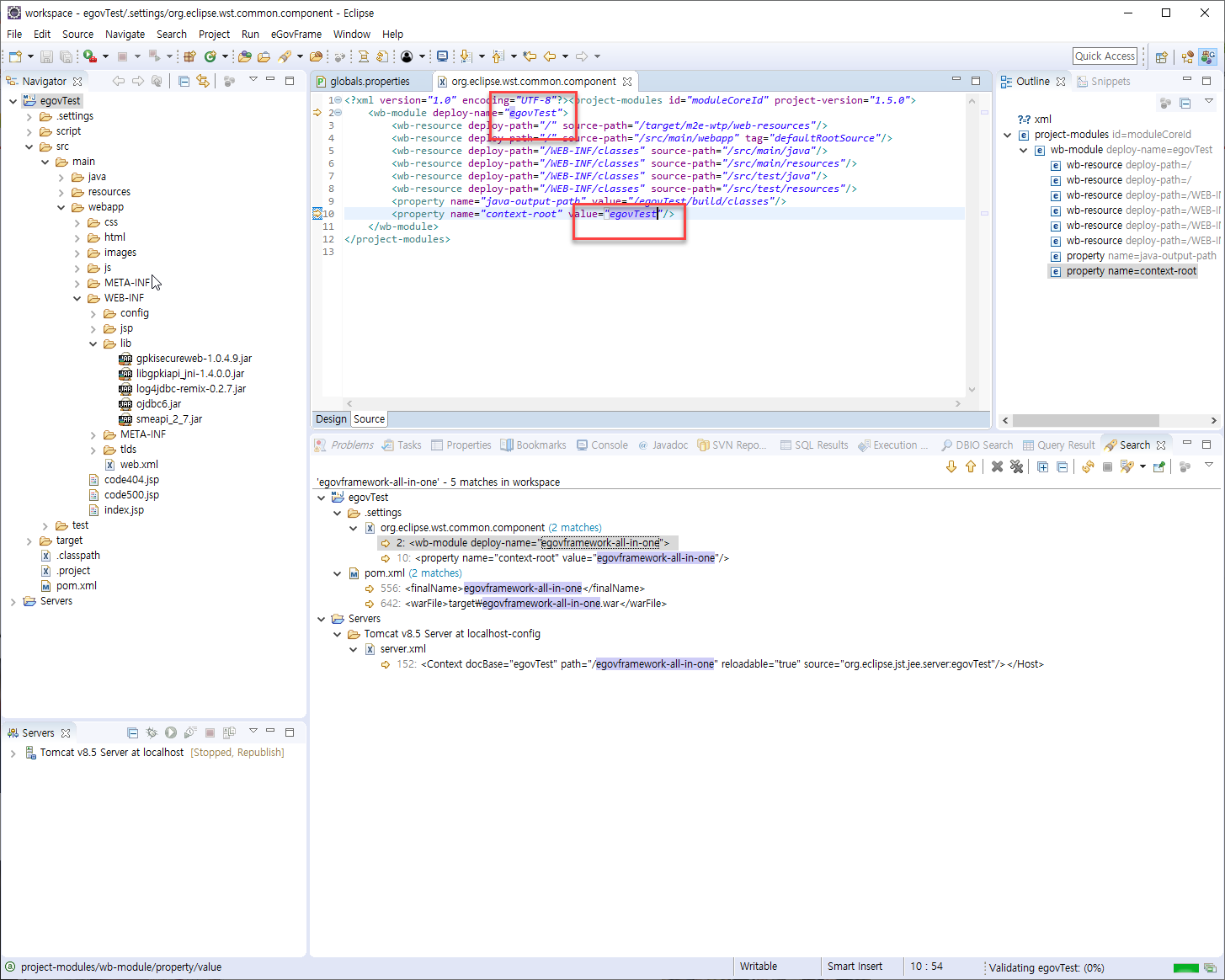 나온 결과에서 egovframework-all-in-one 부분을 하나씩 더블클릭하여 egovTest로 수정한다.