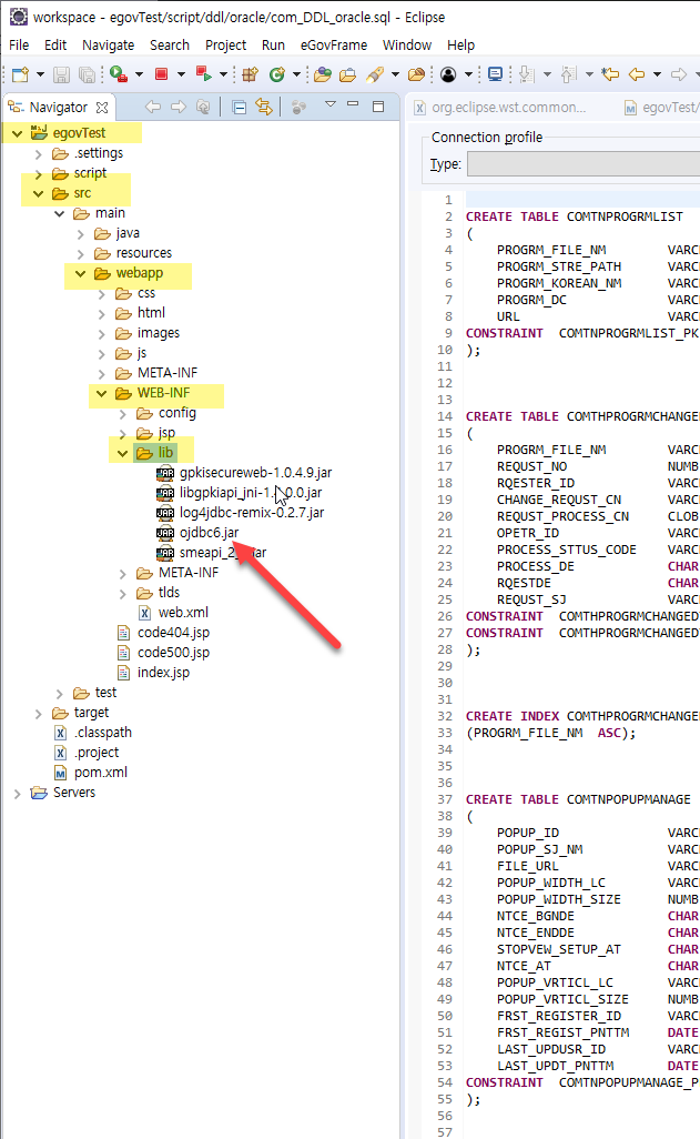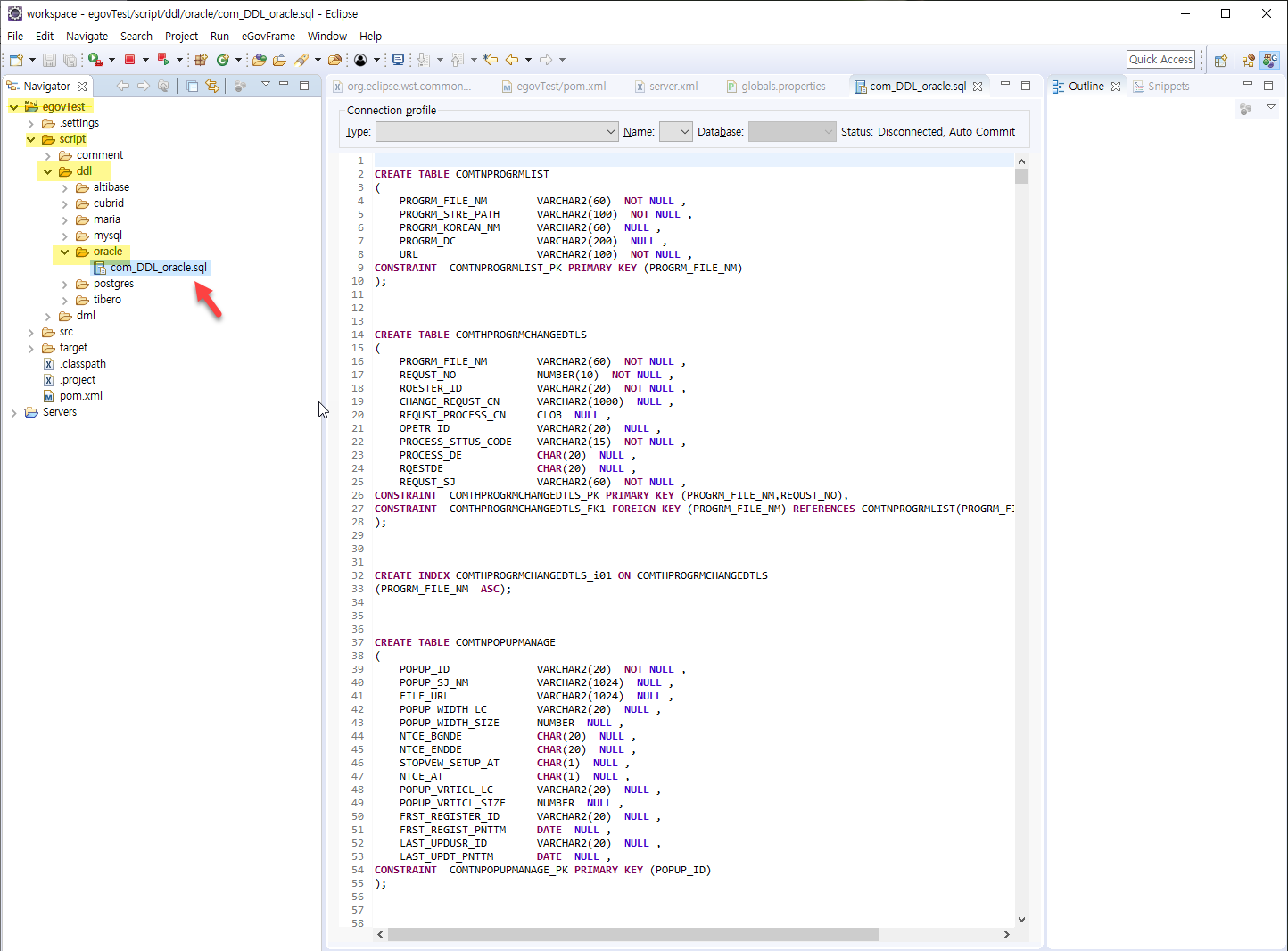 이클립스내에서 프로젝트 > script > ddl > oracle > com_DDL_oracle.sql 을 열어서