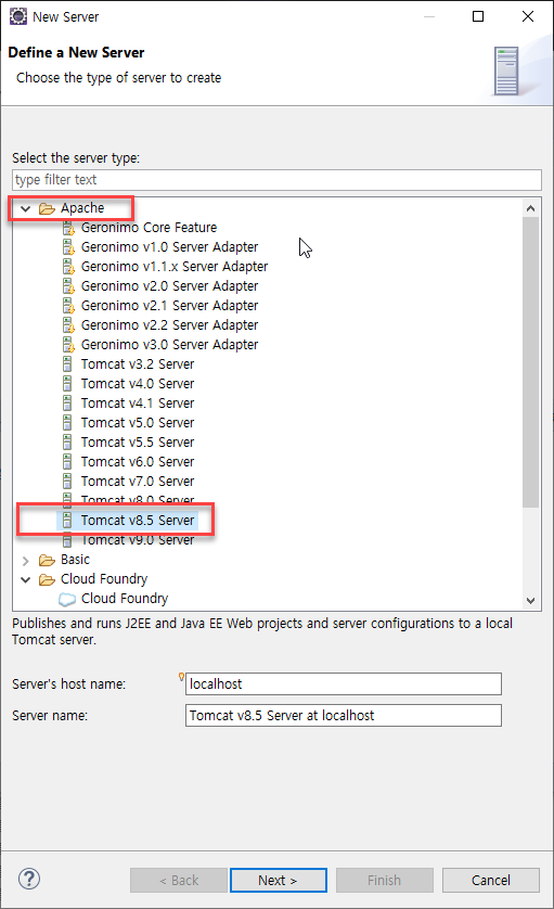 서버 선택하는 화면에서 Apache > Tomcat v8.5 Server를 선택한다.
