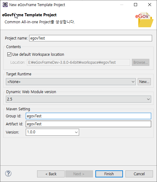 그러나 프로젝트를 생성할 때 egovTest로 진행을 했으니 egovframework-all-in-one을 egovTest 로 변경을 해줘야 한다.