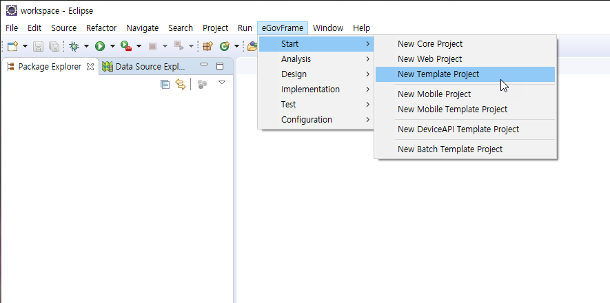 1) eGovFrame > Start > New Templage Project 를 클릭.