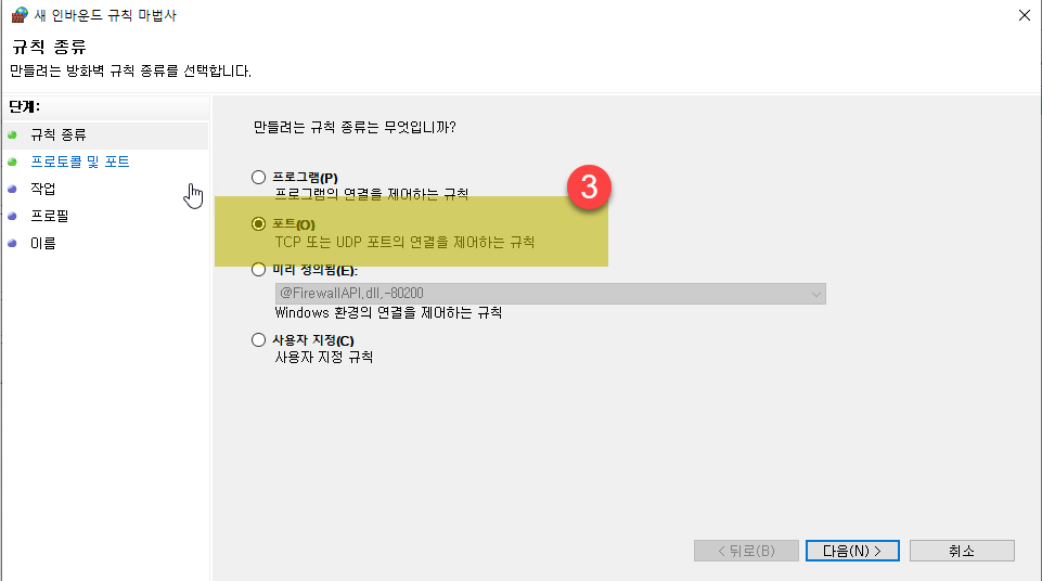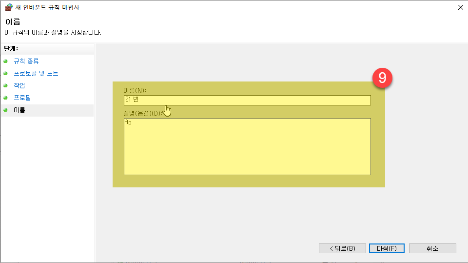 인바운드 규칙 > 새규칙 클릭하여 아래순서대로 진행, 6번에 21이라고 입력한다.