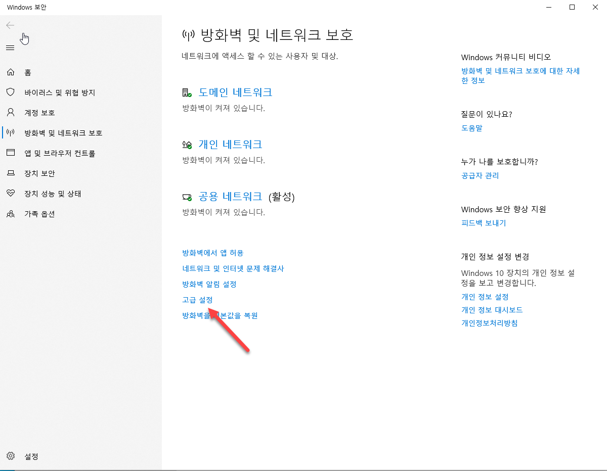 윈도우에서 방화벽 및 네트워크 보호로 이동한다.