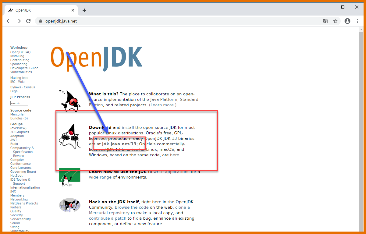 1. 홈페이지에 들어가서 Download and install.... 부분에서 jdk.java.net/13; 를 클릭한다. 맨 마지막 here 를 클릭하면 오라클 사이트로 이동한다.