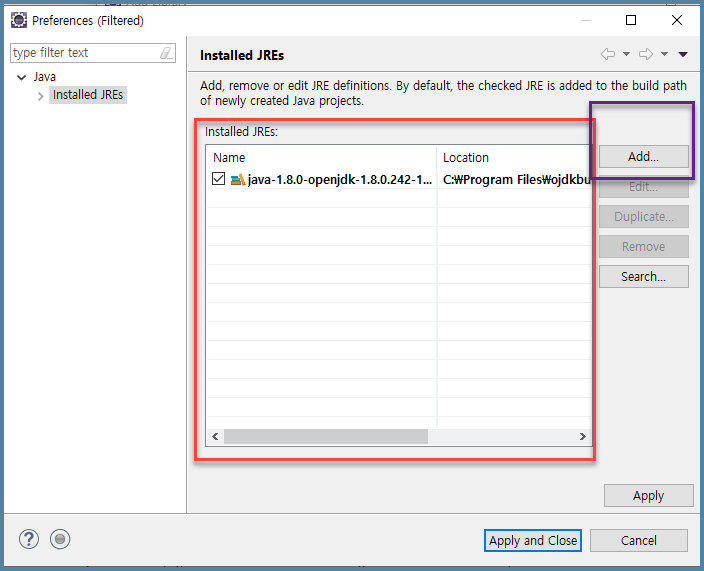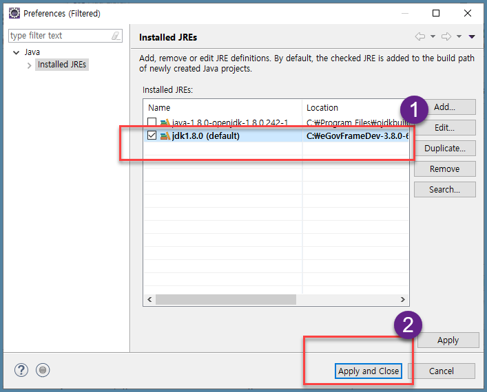 - Installed JREs 화면에 좀 전에 저장한 것이 나온다.