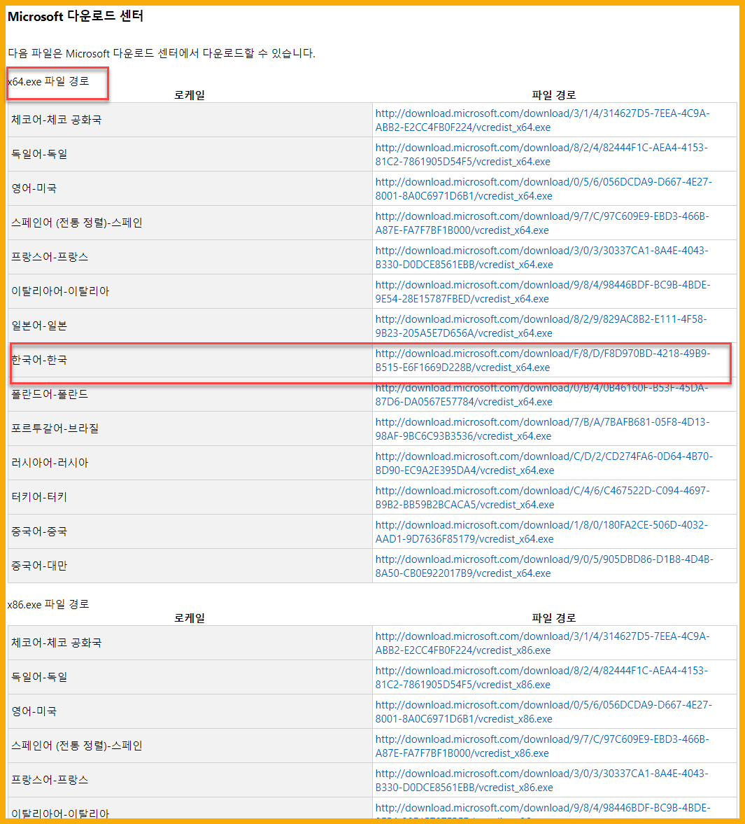 x64.exe 파일 경로에서 한국어-한국의 다운로드를 클릭하여 파일을 다운로드 받는다(64비트)