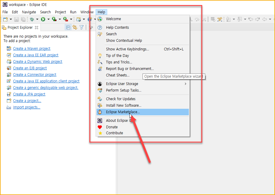 - Help > Eclipse Marketplace... 을 클릭하여 들어간다.