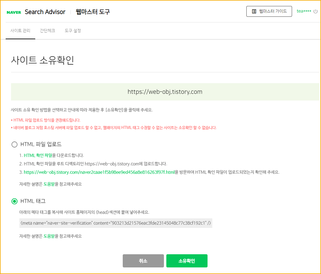 사이트 소유확인이 완료되었다.