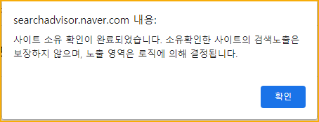 붙여넣고 나서 소유확인을 클릭하고 요상한 문자를 입력하고 나면 아래와 같이 알림창이 뜬다.