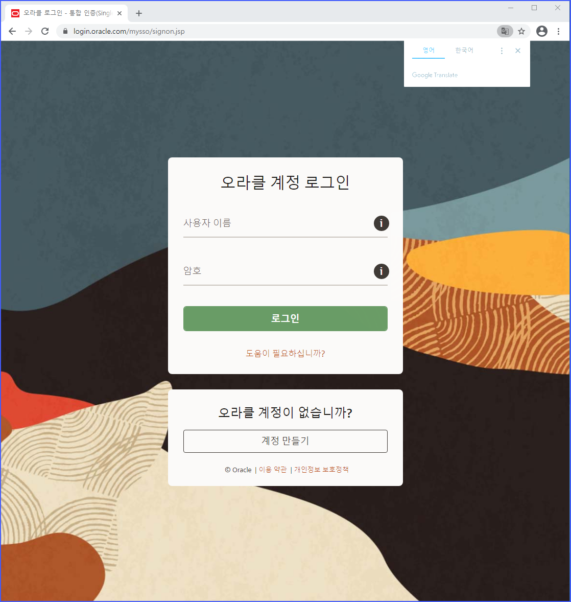 4. 아래와 같이 오라클 로그인 화면이 나오는데 계정정보를 입력하고(없으면 새로 생성해야 함) 로그인을 클릭하면 파일이 다운로드가 시작된다.