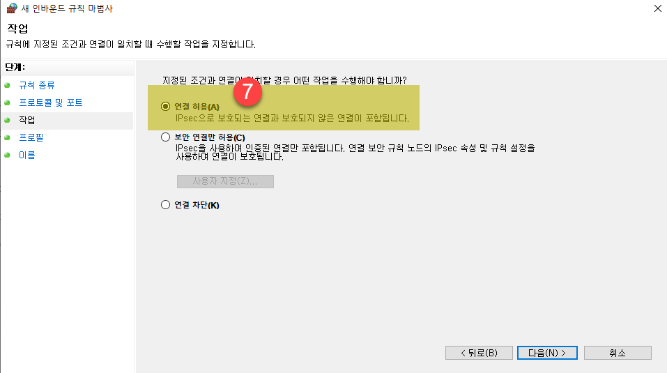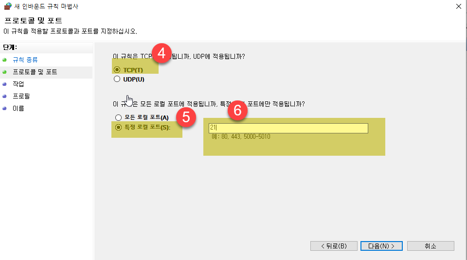 인바운드 규칙 > 새규칙 클릭하여 아래순서대로 진행, 6번에 21이라고 입력한다.