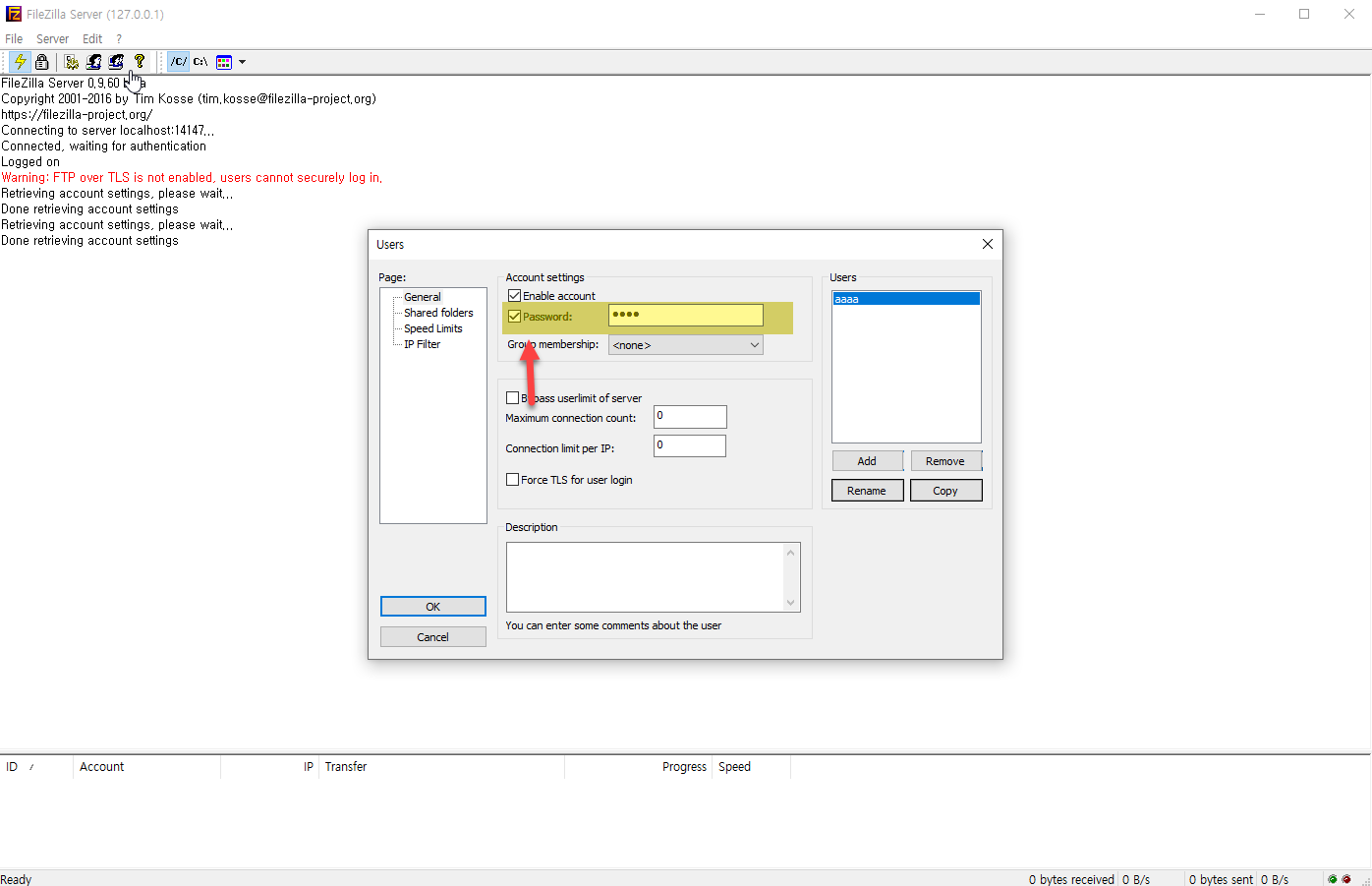 - 아이디를 추가한 후에 비밀번호도 설정해준다.(파일질라 서버는 아이디와 비밀번호를 한번에 입력하게 두지 않은 모양이다)