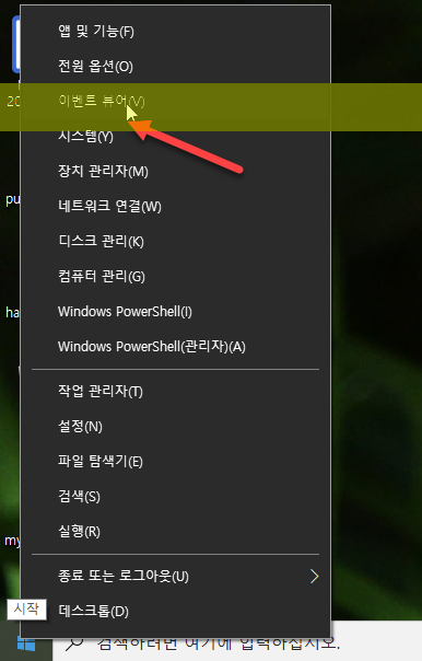 시작 > 마우스 오른쪽 버튼 > 이벤트 뷰어