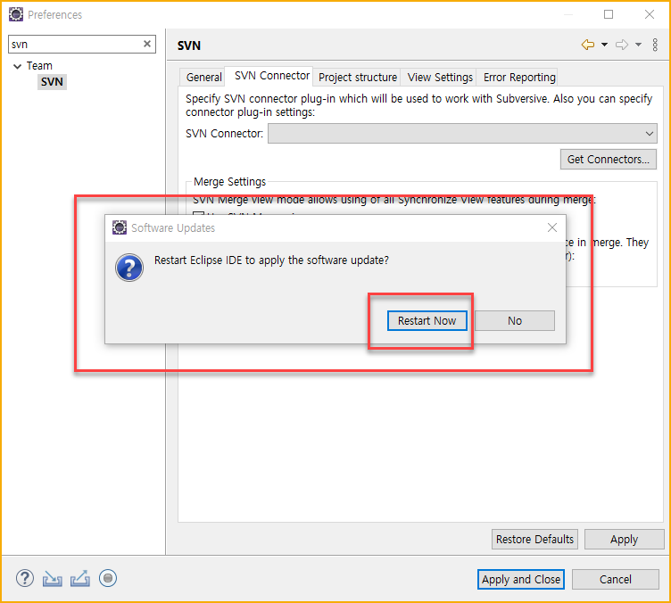 - Windows > Preference > Team > SVN > SVN Conector 탭으로 이동한다.