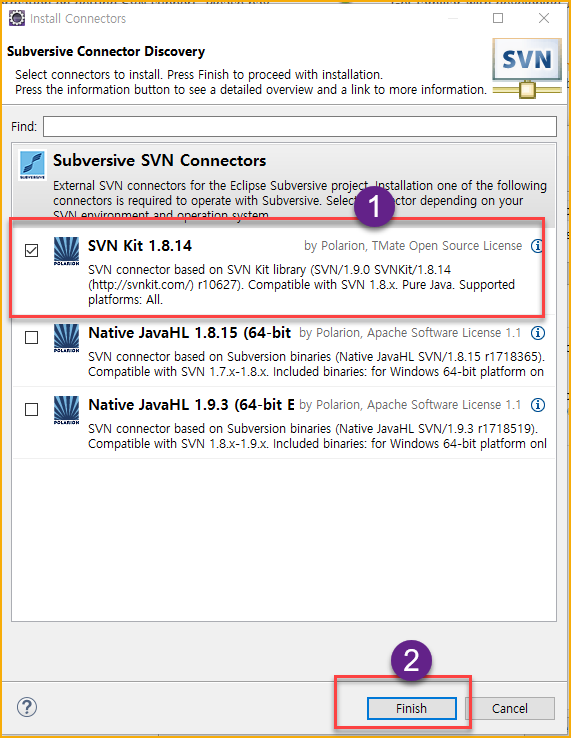 - Find 부분에 svn 이라고 입력하고 엔터를 친다.