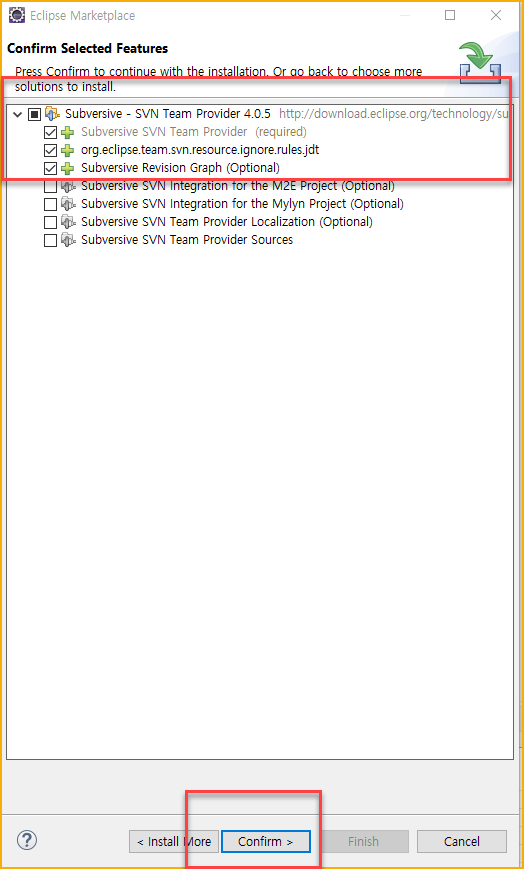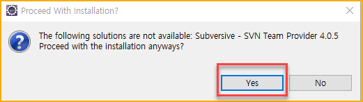 - 검색결과에서 첫번째 있는 Subversive - SVN Team Provider 를 install 한다.