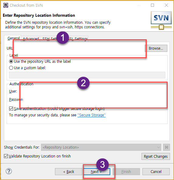 - svn 이라고 입력을 하면 Project from SVN이 나온다. 선택을 하고 Next 를 클릭한다.