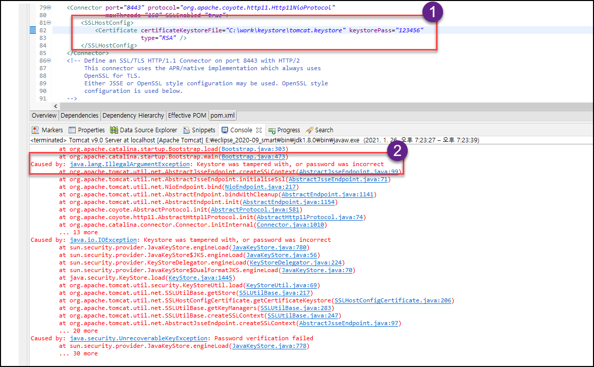 이클립스에서 톰캣에 ssl 설정을 하여 톰캣을 기동하면 아래와 같은 오류가 난다.