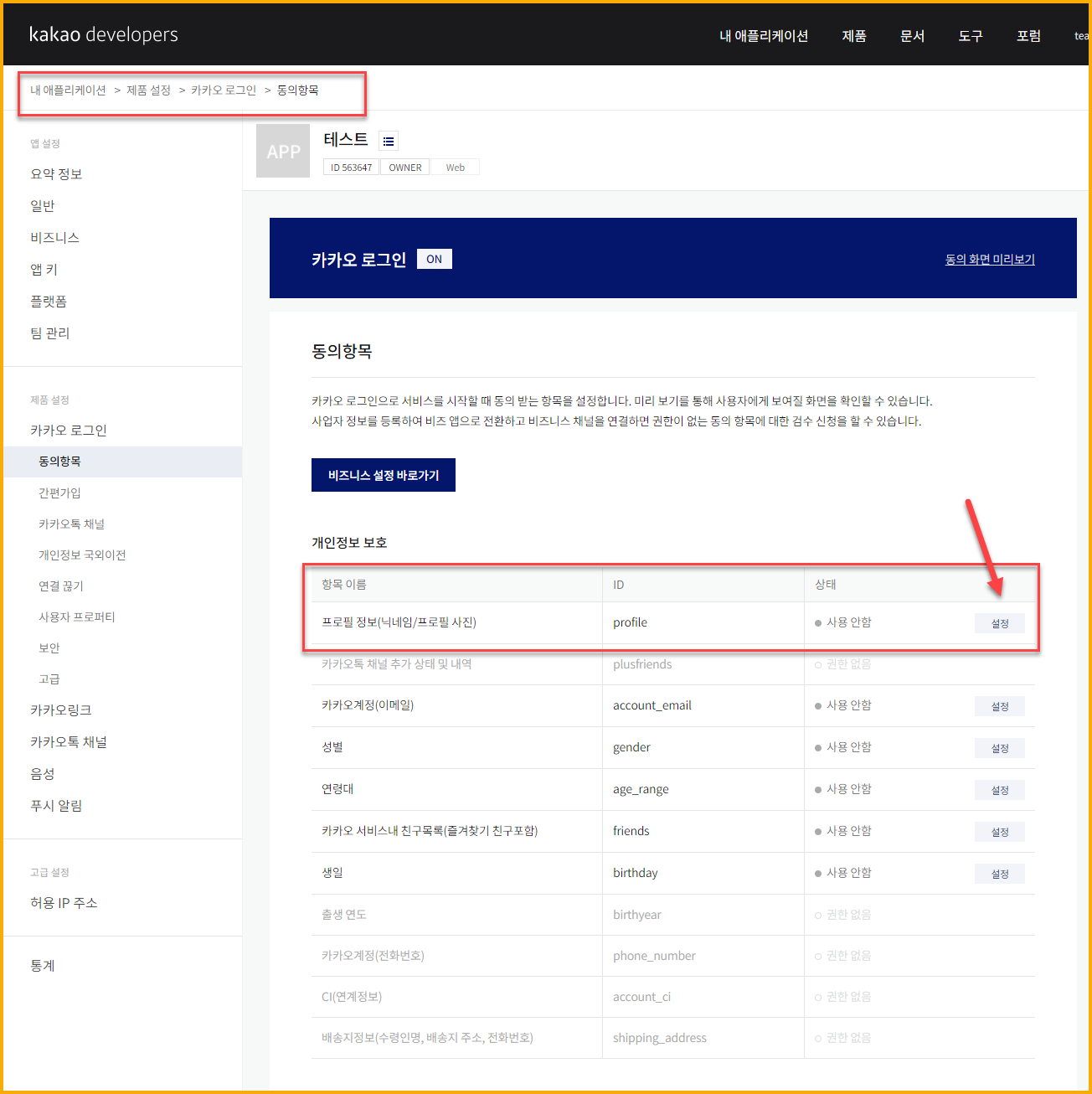 App disabled [profile] scopes for [TALK_PROFILE] API on developers.kakao.com. Enable it first
