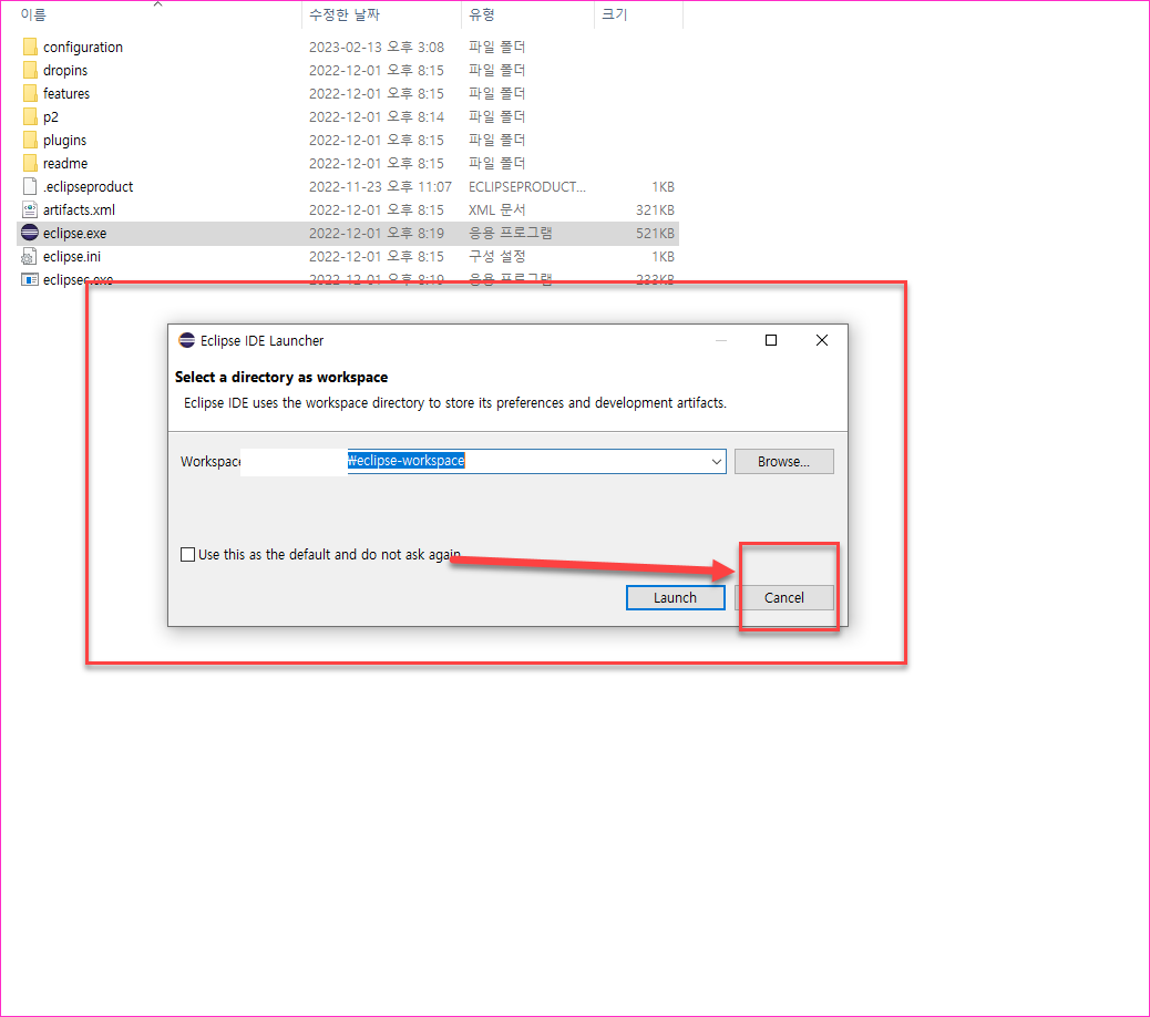 - 이클립스를 실행해본다.(eclipse.exe 더블 클릭). 아무것도 하지 않을거라 화면이 뜨면 바로 창을 닫을것이다.