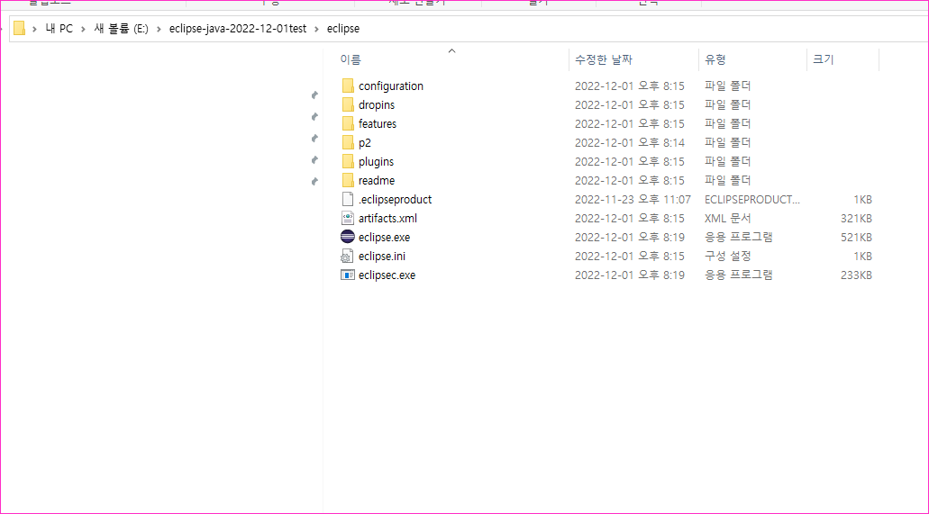 - 폴더구조가 eclipse-java-2022-12-01test/eclipse/다수의 파일들 구조가 된다.