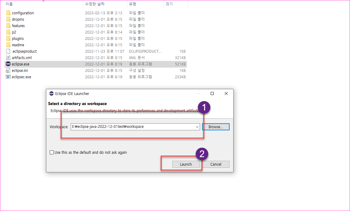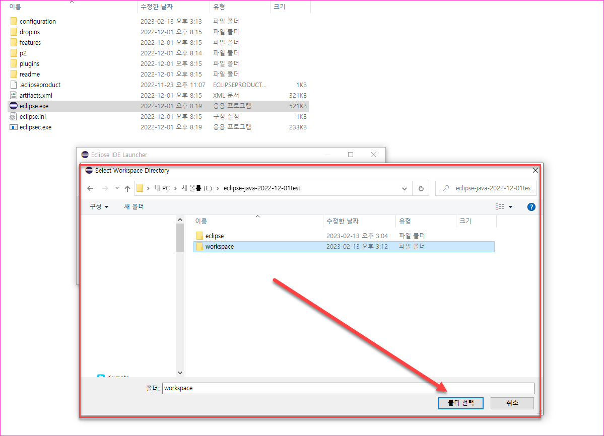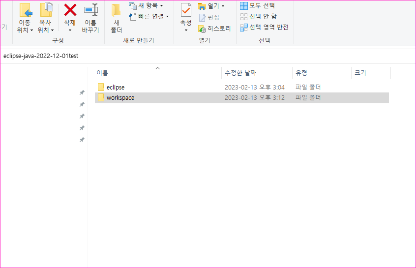 - eclipse-java-2022-12-01test 하위에 workspace 폴더를 하나 만든다. 꼭 여기여야 할 필요는 없지만.. 나는 계속 이렇게 해왔으므로 여기에 둔다.